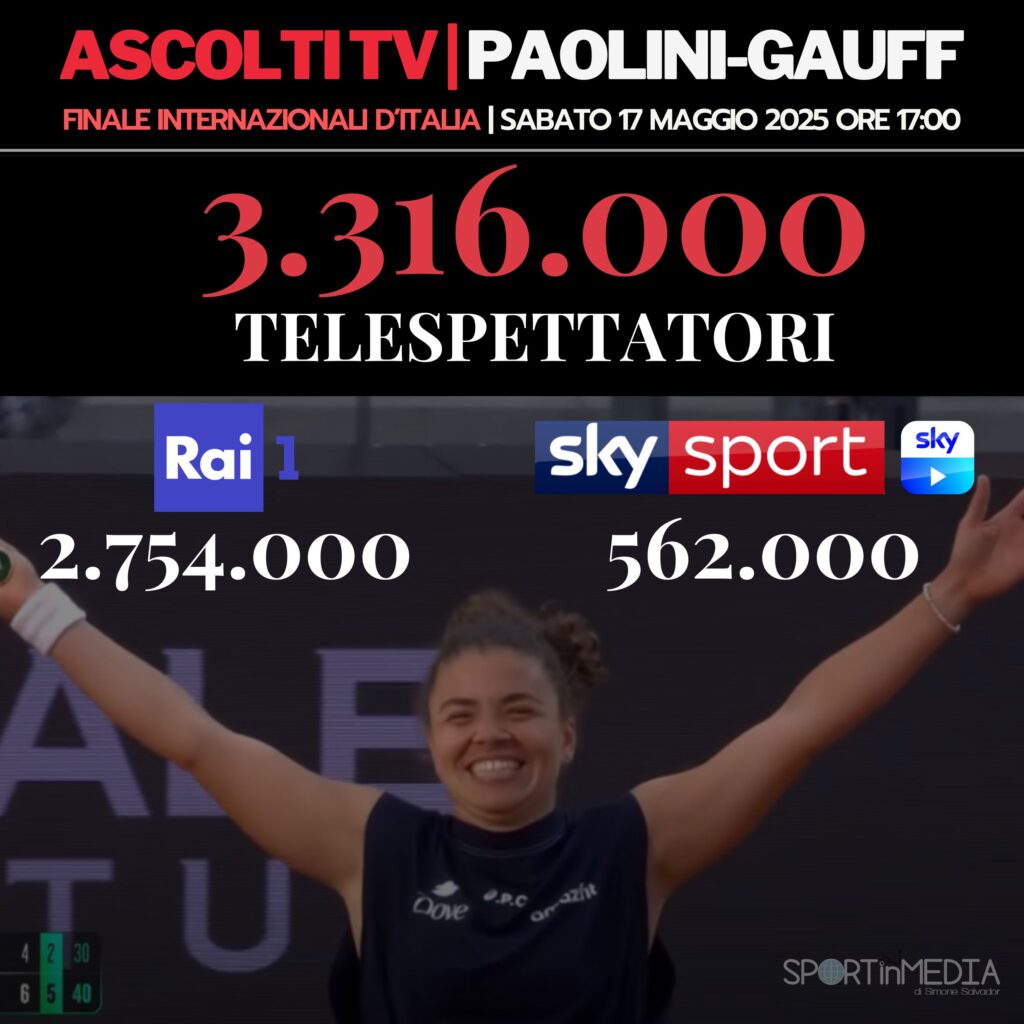 - 3) 17/05 17:10 Paolini – Gauff (Rai 1 + Sky) 3.309.000