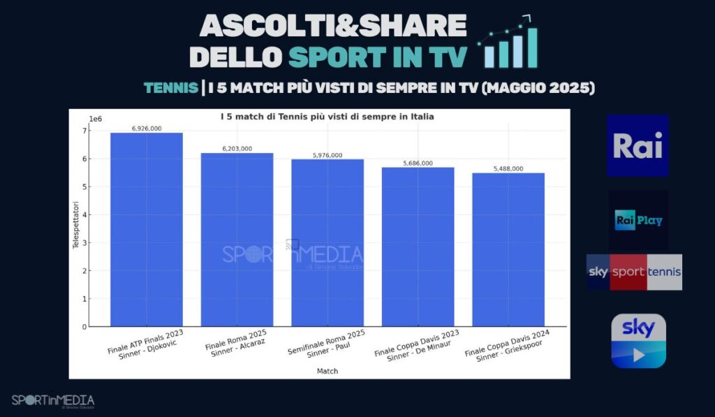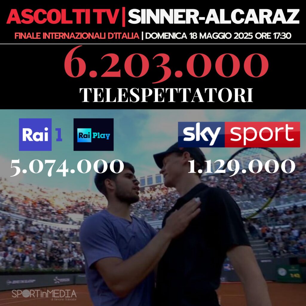 - 1) 18/05 17:25 Sinner – Alcaraz (Rai 1 + Sky) 6.203.000