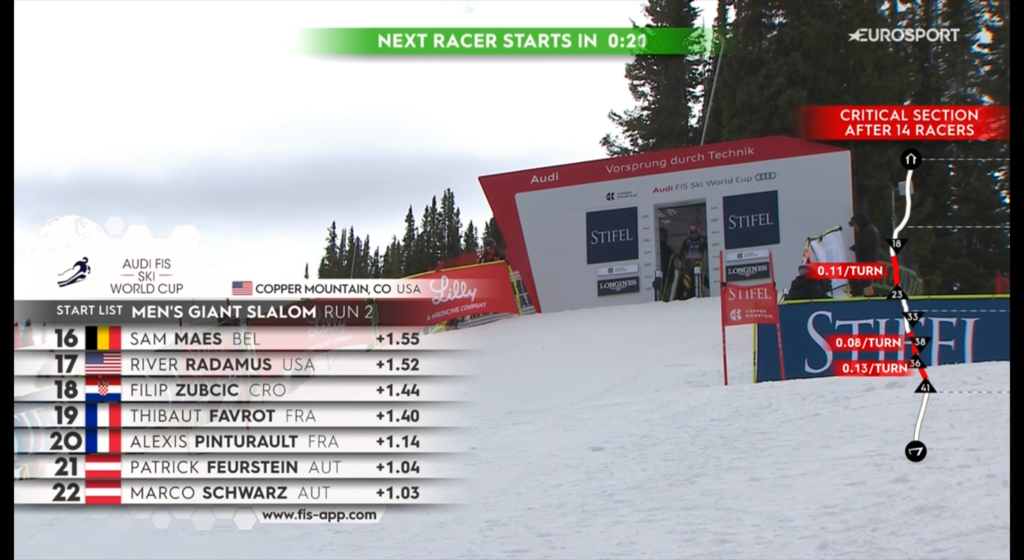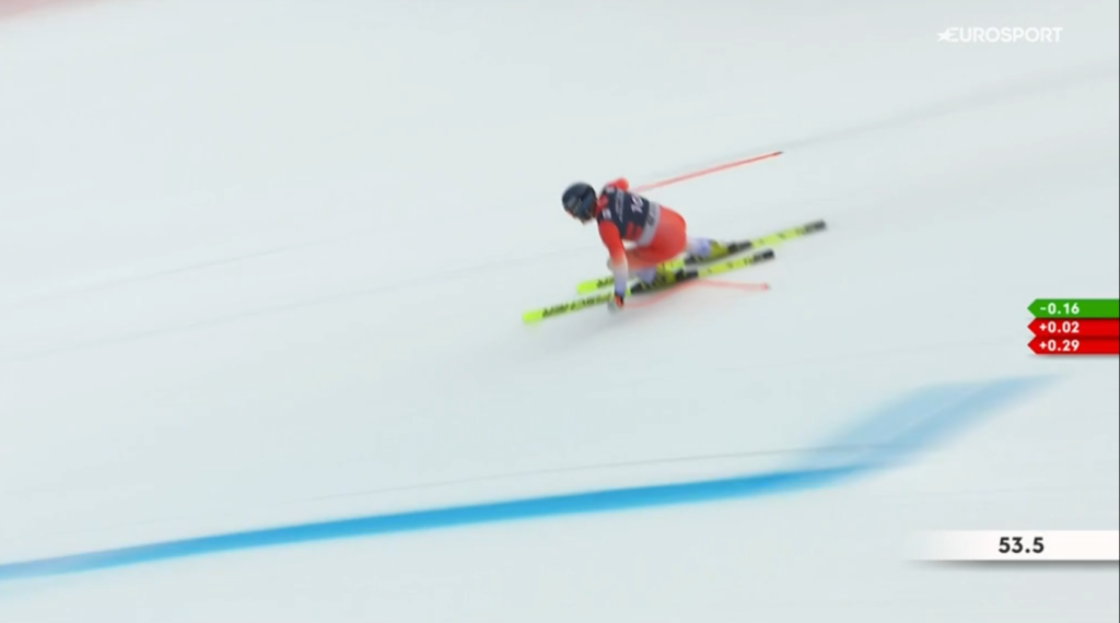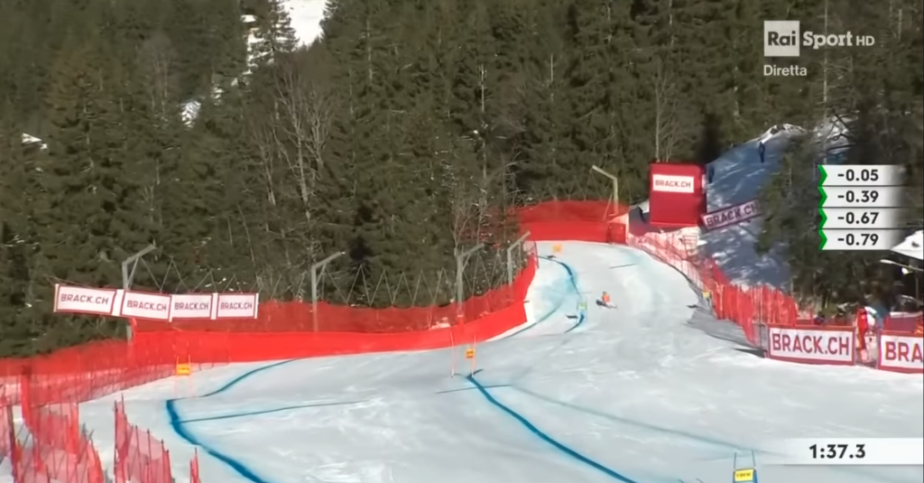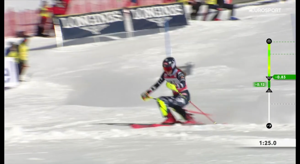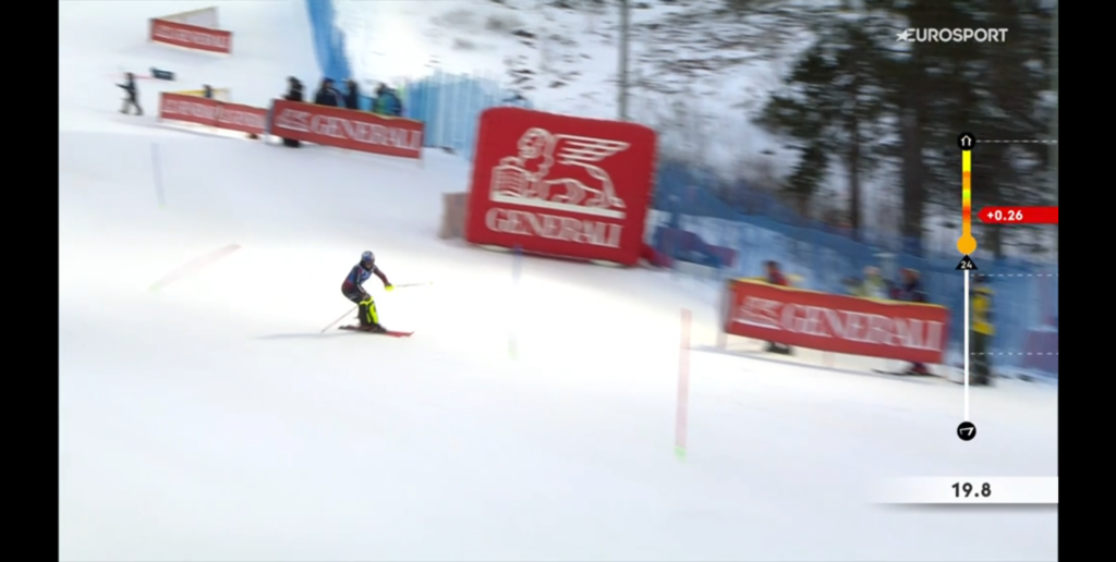 La novità di quest’anno è rappresentata proprio dall’indicazione numerica della singola porta appena superata dallo sciatore durante la propria discesa, che permetteva (presumo) all’intelligenza artificiale, di isolare un determinato tratto di pista in cui l’atleta ha perso terreno o ha guadagnato un rilevante vantaggio rispetto agli altri.