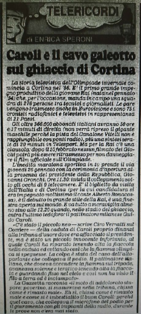 Vediamo in un filmato amatoriale dalla cerimonia di apertura di Cortina 1956. Il pattinatore-tedoforo Guido Caroli che cade mentre si avvicina al braciere. Purtroppo il video amatore ha staccato proprio mentre il cerimoniere sta per andare a terra.
