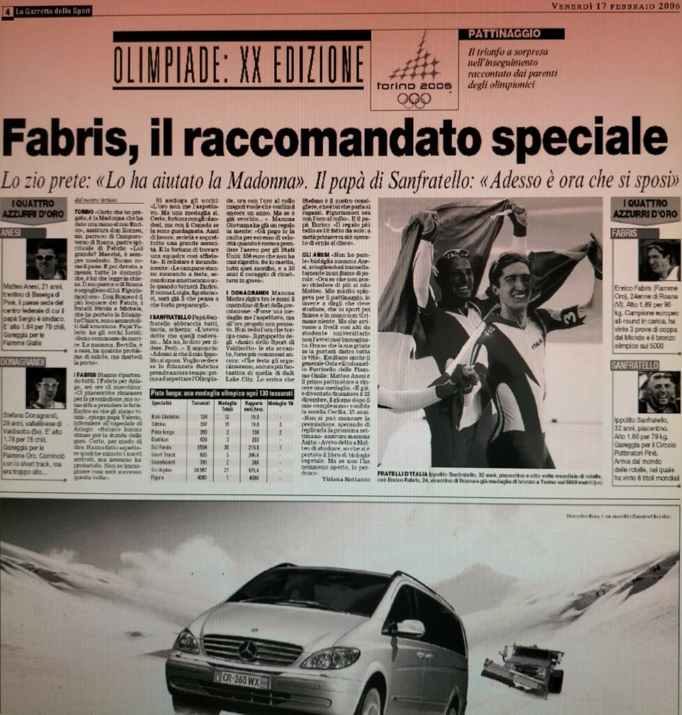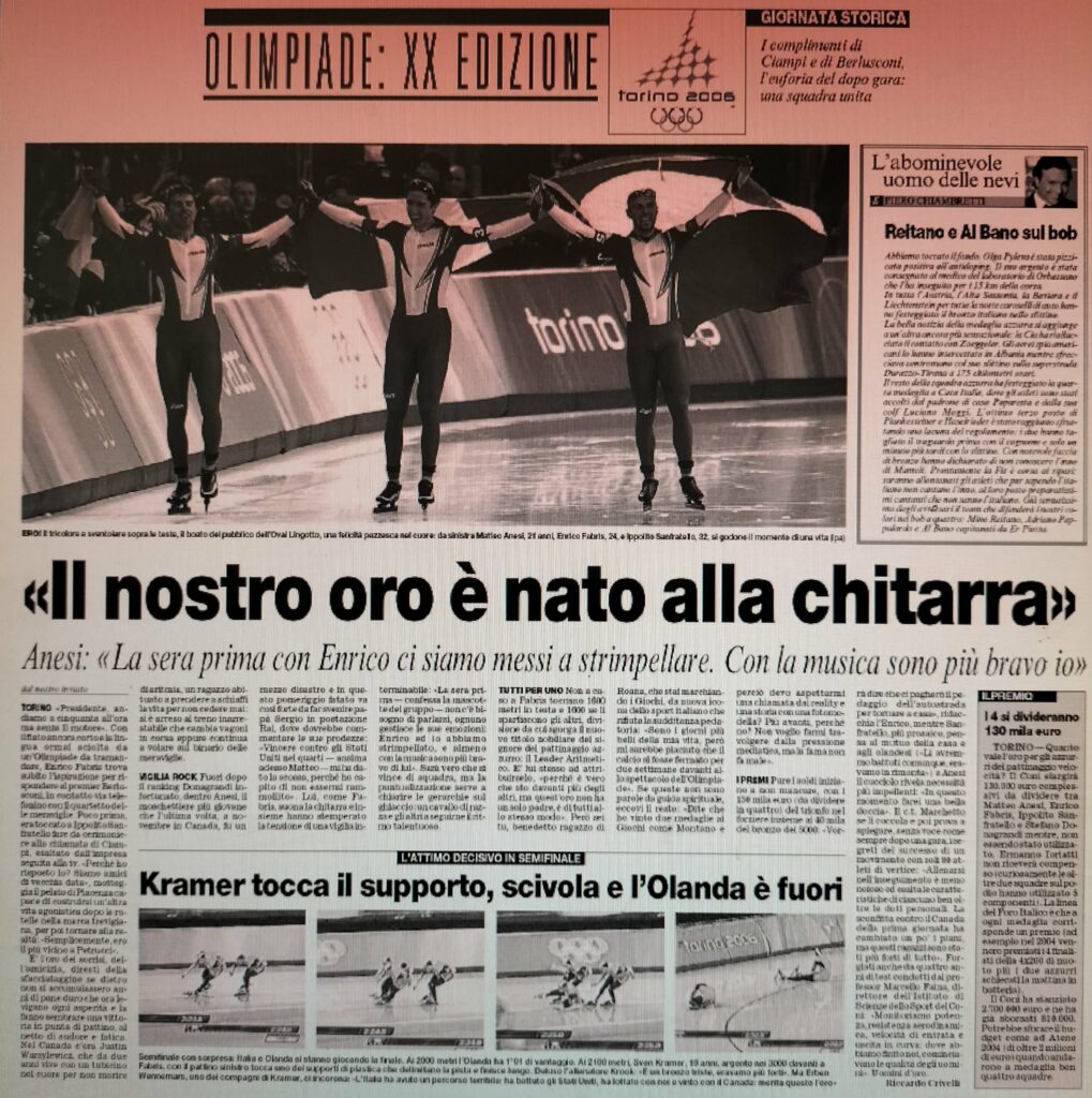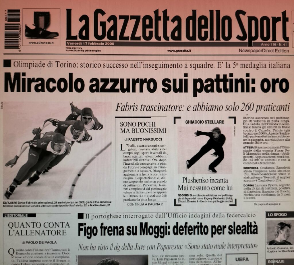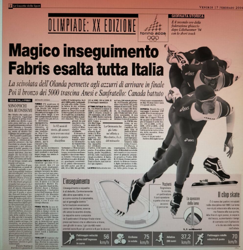 C’è un pattinaggio che sta vivendo uno dei momenti migliori. Nella prova a squadre, nuova del programma olimpico con formula chiaramente ripresa dal ciclismo, si può dire che la medaglia d’oro viene vinta in semifinale, superando l’Olanda per via di una caduta di Sven Kramer, il tulipano più rappresentativo Sarebbe ingeneroso per l’Italia dover attribuire alla circostanza il profilo della fortuna ma questo episodio apre la strada per il gradino più alto. D’altronde alle Olimpiadi può avvenire tutto, anche che un fuoriclasse come Kramer possa sbagliare, aprendo all’Italia la finale contro il Canada. Nello stesso pomeriggio, la finale contro i nordamericani, formazione di grande spessore ma non certo l’Olanda. Non più abituati a vivere nel ciclismo su pista le emozioni di una finale olimpica, tocca al pattinaggio riproporcele. Ed è oro con Fabris, Anesi e Sanfratello ad aprire l’albo d’oro.