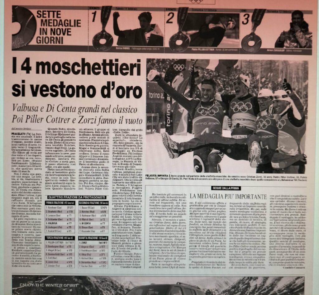 Domenica straordinaria per la staffetta del fondo. Dopo le Olimpiadi di Lillehammer, l’oro che aveva zittito i norvegesi, le successive due staffette avevano riproposto la medesima volata a due fra Italia e Norvegia, con doppia affermazione del quartetto nordico. Stavolta però la Norvegia fatica. Per evitare le incertezze di una nuova volata stavolta contro Germania oppure Svezia arriva una vittoria per distacco. Per Valbusa, Di Centa, Piller Cottrer, Valbusa e Zorzi il coronamento di una decennale carriera.