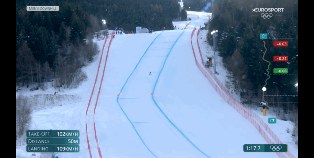 Una volta, poi, che lo sciatore era atterrato dopo il muro di San Pietro, veniva sovraimpressa la grafica con la proposizione della velocità di stacco, della lunghezza del salto e della velocità fatta registrare al momento dell’atterraggio.