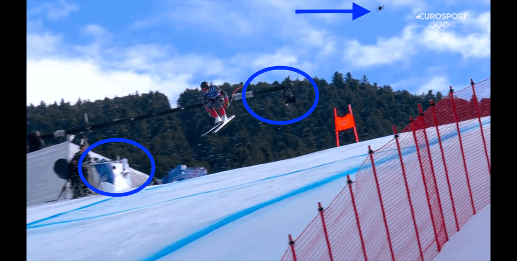 Rimanendo sempre in tema di salti, notevole era la copertura di camere dei punti del tracciato che permettevano agli sciatori di staccarsi da terra, come, ad esempio, si può vedere nel frame sottostante ove sono stati immortalati (oltre al drone all’inseguimento del discesista) un lunghissimo crane e una polecam.