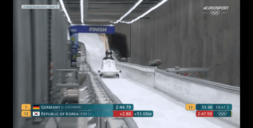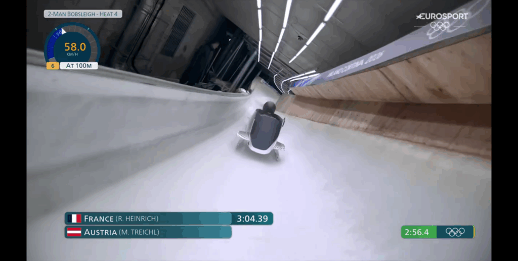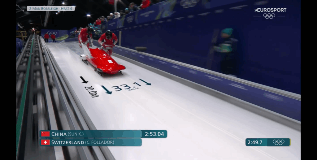 Come, ad esempio, l’indicazione nella grafica sovraimpressa durante la spinta (anche) della distanza in tempo reale progressivamente percorsa dal bob, oltre alla sua velocità, grafica, codesta, con cui avevamo familiarizzato durante le gare di skeleton (non in quelle di slittino).