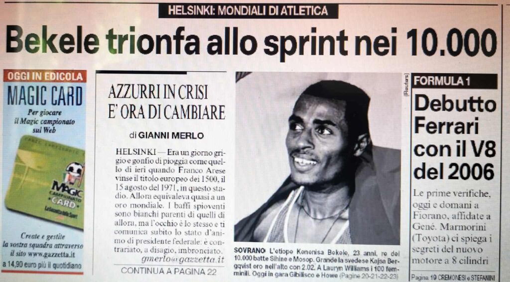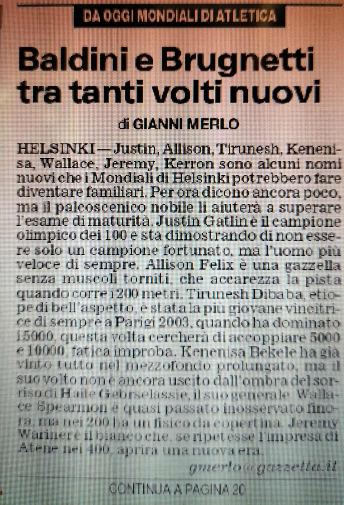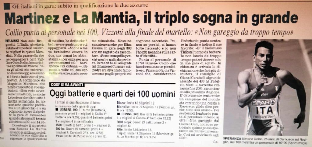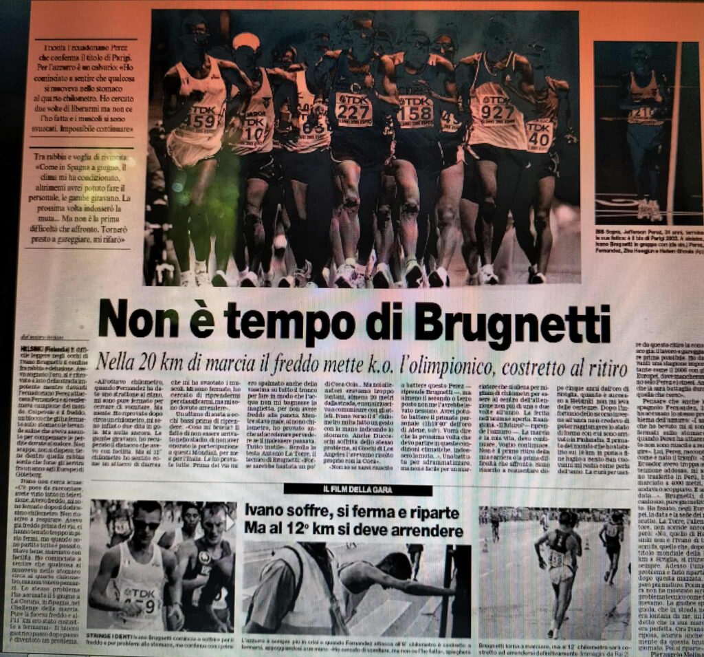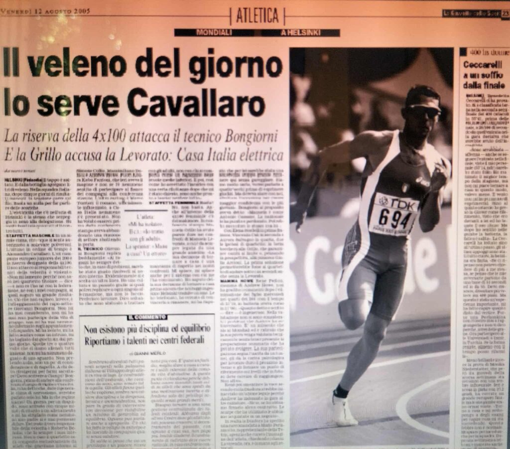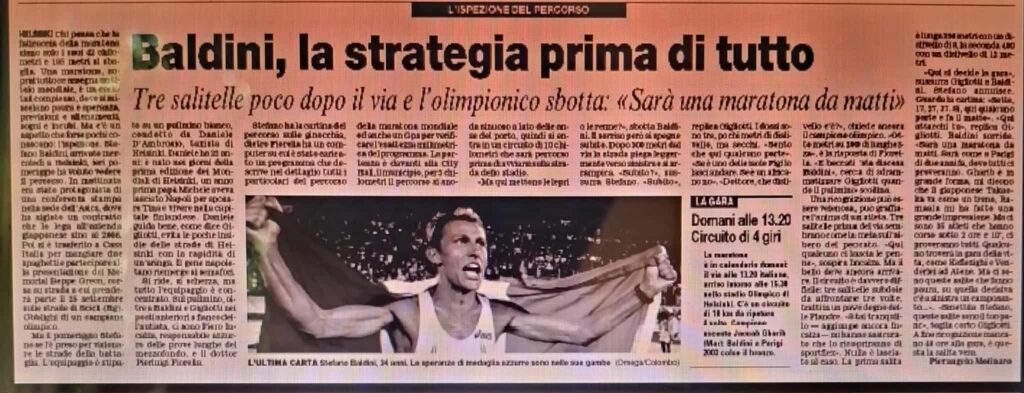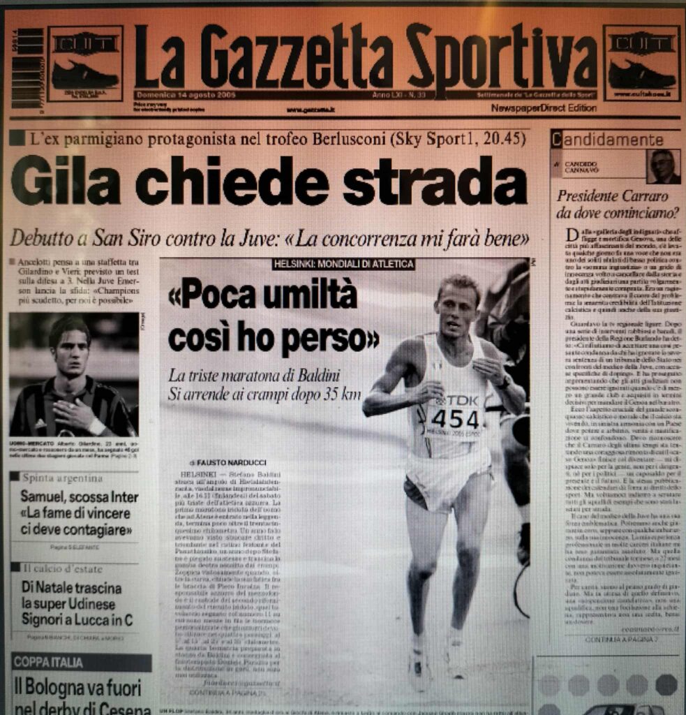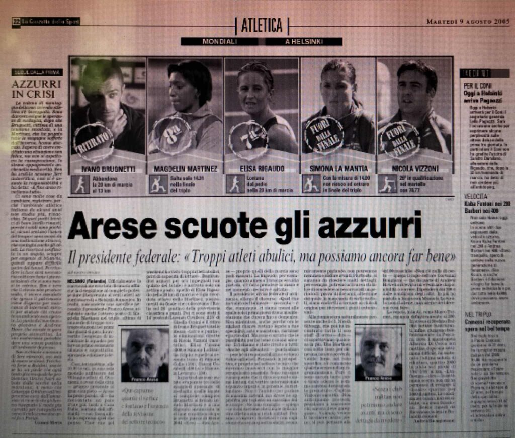 Detto questo, possiamo invece affermare che in senso inverso, l’edizione di Helsinki 2005 è stata per l’Italia delle piste e delle pedane una delle più scadenti. Si arriva al contesto finlandese ancora con la fiducia di portare a casa un titolo: andando a ritroso nelle più vicine edizioni c’era stato il successo di Gibilisco nell’Asta del 2003, l’oro di Fiona May del 2001, l’affermazione di Mori nel 1999, accompagnata dal titolo di Brugnetti nella marcia. Senza dover continuare ancora all’indietro, solo a Stoccarda 1993, si era tornati senza titoli mondiali. Il già citato Brugnetti aveva vinto anche alle Olimpiadi del 2004, che poi si erano concluse con un vento di osanna chiamato Baldini nella maratona.