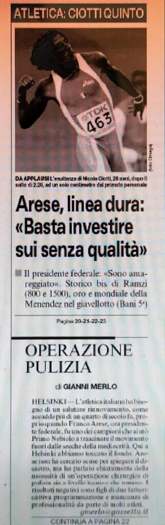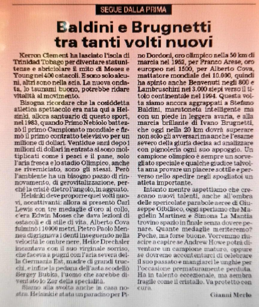 Ma il vento di Helsinki, metaforicamente e meteorologicamente, è ben diverso dalla prima edizione del 1983, ricordata per il trionfo di Cova e per gli ultimi grandi momenti da medaglia di Mennea. L’unico bronzo è dell’altoatesino Alex Schwazer dalla 50 km, allora semisconosciuto. I più attenti aficionados ricorderanno che questo video fu mostrato da Sportinmedia allorché il marciatore presentò una sua iniziativa editoriale.