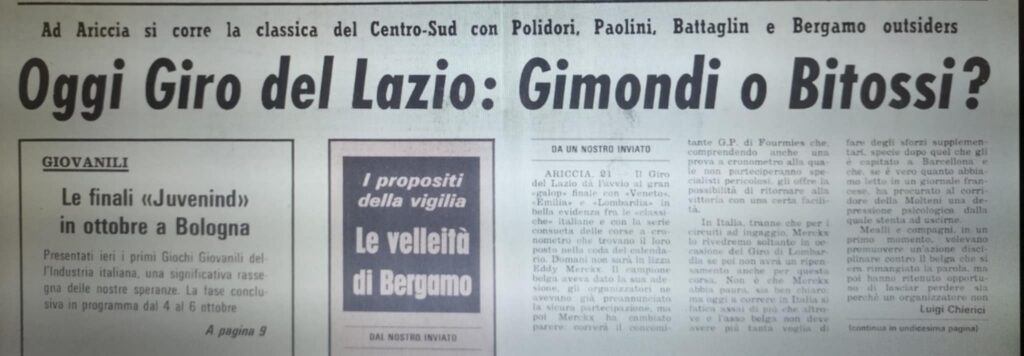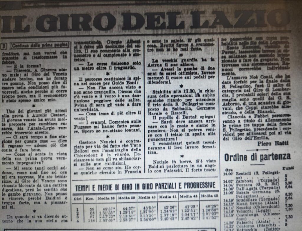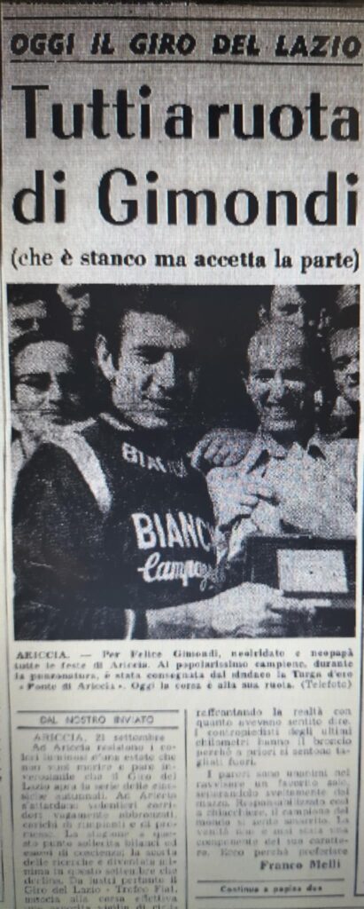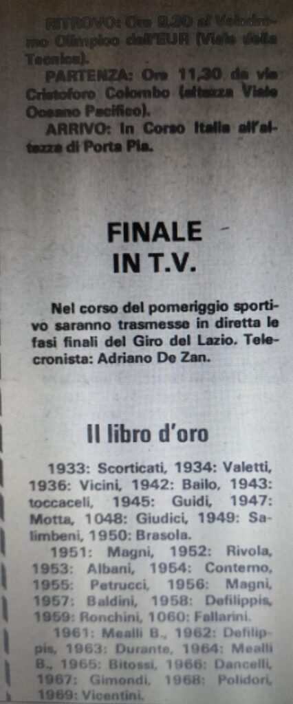 Non del tutto casualmente, visto il prossimo epilogo del Giro d’Italia a Roma, ci occupiamo, per “ruote interposte” di una corsa che non esiste più, pur avendo scritto la storia del ciclismo nazionale, il Giro del Lazio. Lo faremo in due puntate, parlando in questa occasione delle edizioni del secolo scorso e poi, la prossima settimana delle corse più recenti, fino alla brutale chiusura (per una corsa così gloriosa), avvenuta nel 2014.