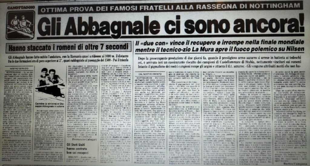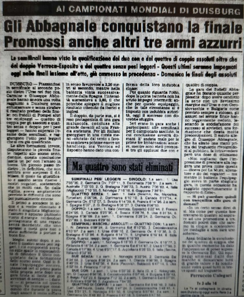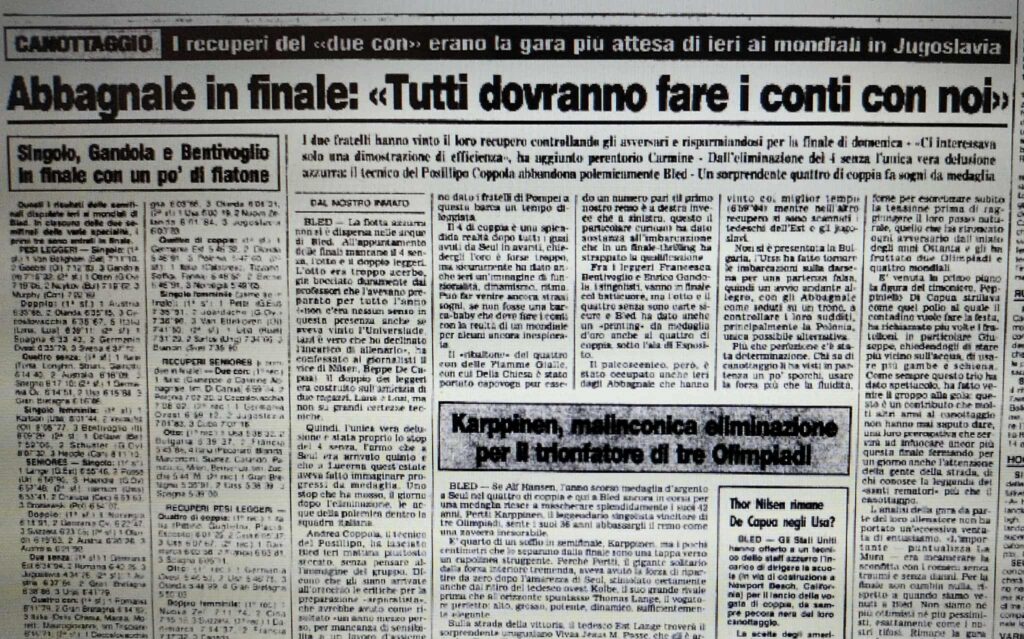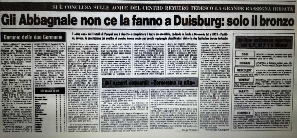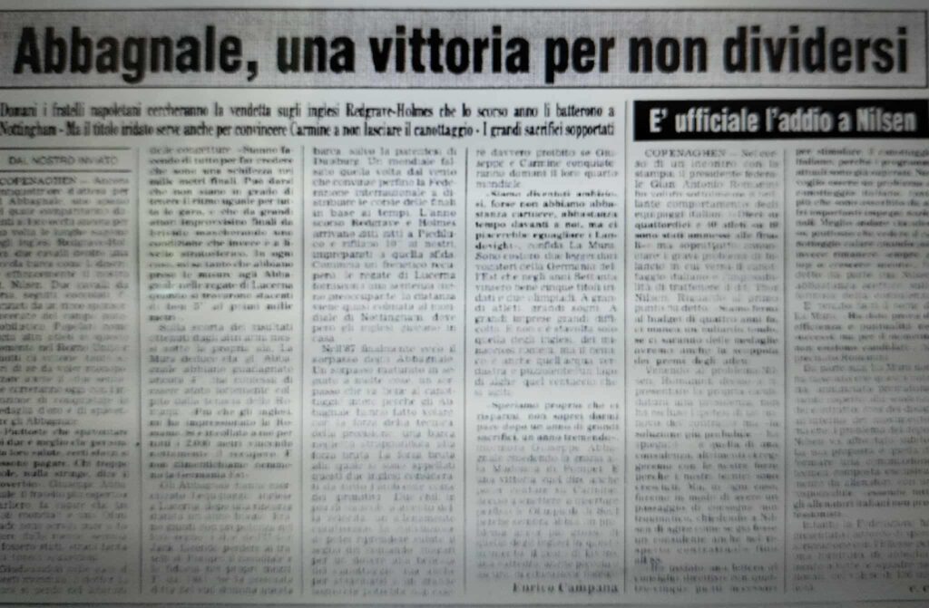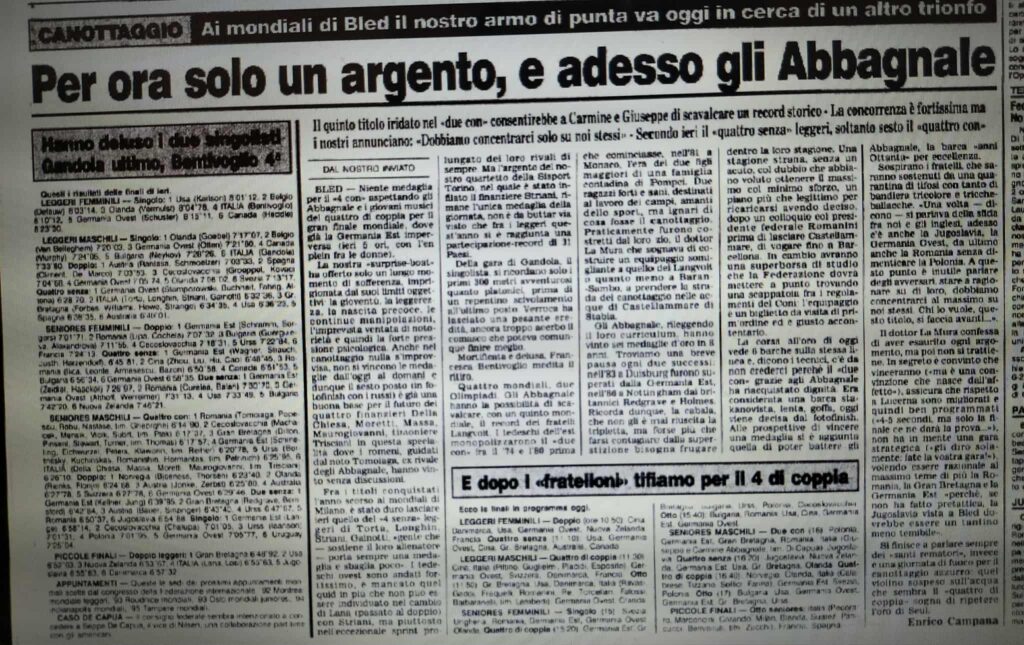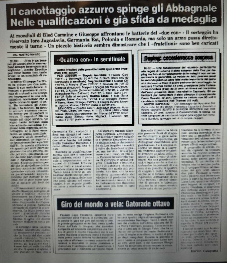 Chiudiamo con un editoriale di Giampiero Ormezzano per LA STAMPA: il testo testimonia, come nessuno avrebbe potuto fare meglio il sentimento della stampa italiana verso gli Abbagnale, sempre vincenti, eppure messi talvolta in secondo piano, ad esempio, dai capricci di Maradona di quell’estate.