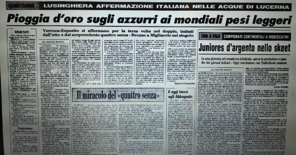 Come se non bastasse a rendere magica quella notte così lontana e così fausta il quattro di coppia con Agostino Abbagnale, Poli, Tizzano e Farina, ci regala un altro splendido bis. Trema la voce di Galeazzi, nell’entusiasmo di una vittoria sperata ma non scontata.