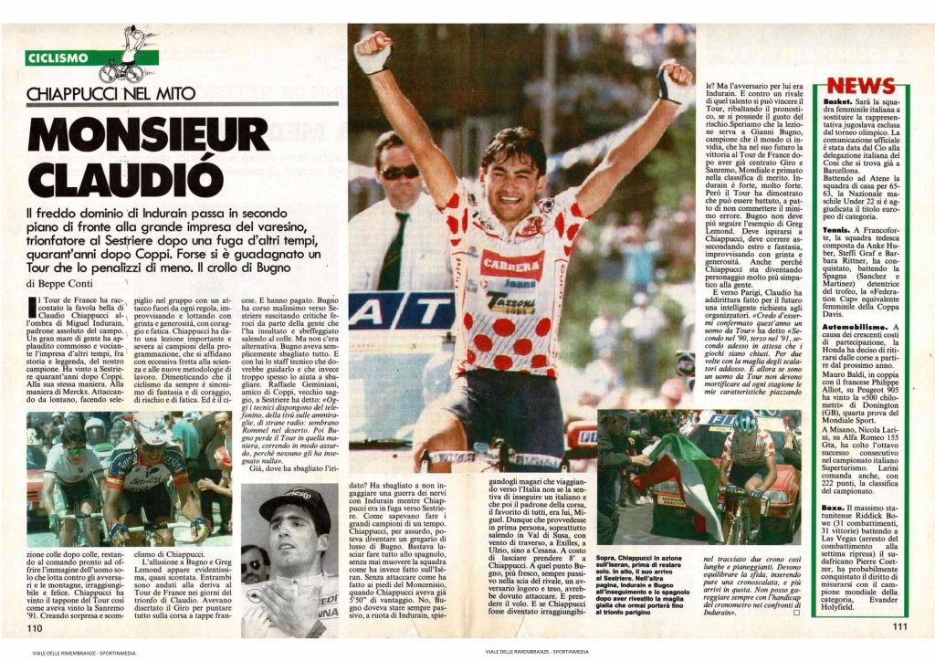Ed ora un salto in edicola per una doppia pagina su Chiappucci, vincitore alla Bartali della tappa epica del Sestriere nel 1992, in cui mette in difficoltà anche il fuoriclasse Miguel Indurain.