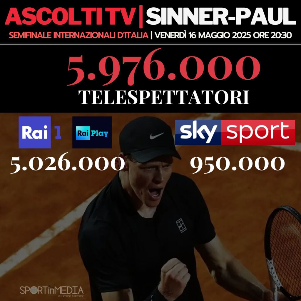 Sinner-Paul, semifinale degli Internazionali d’Italia 2025 è stata trasmessa in diretta in prima serata da Rai 1 (e da Sky Sport) ottenendo un grande successo di pubblico: quasi 6 milioni di telespettatori.