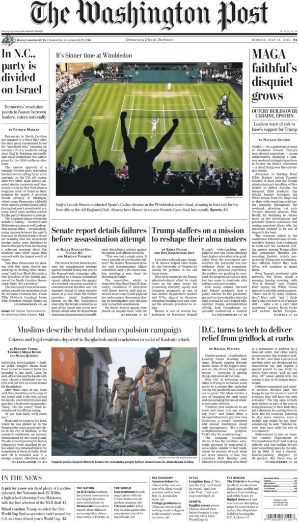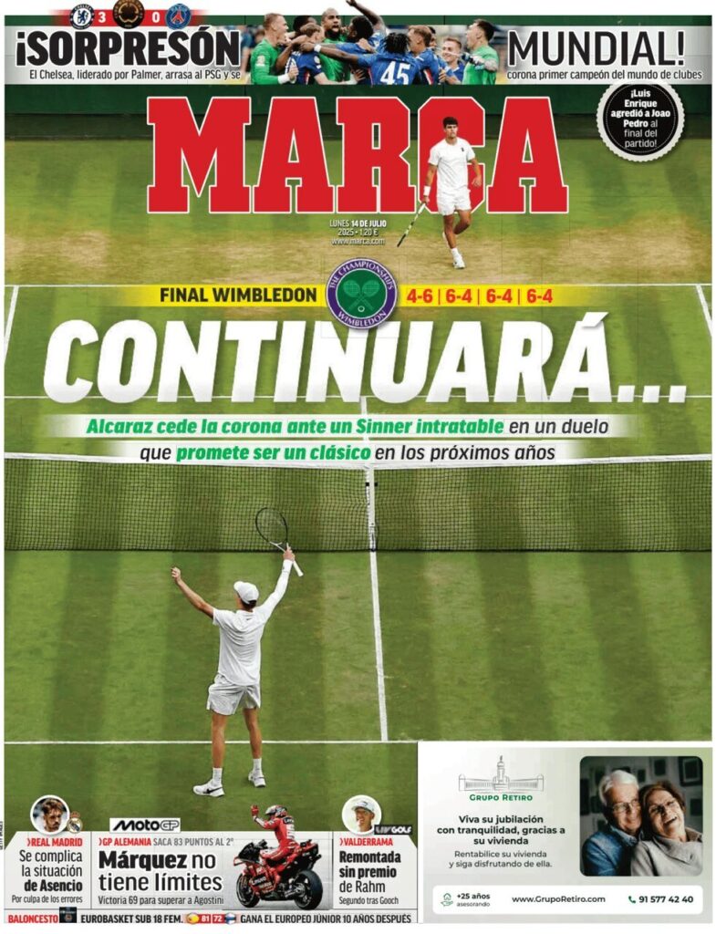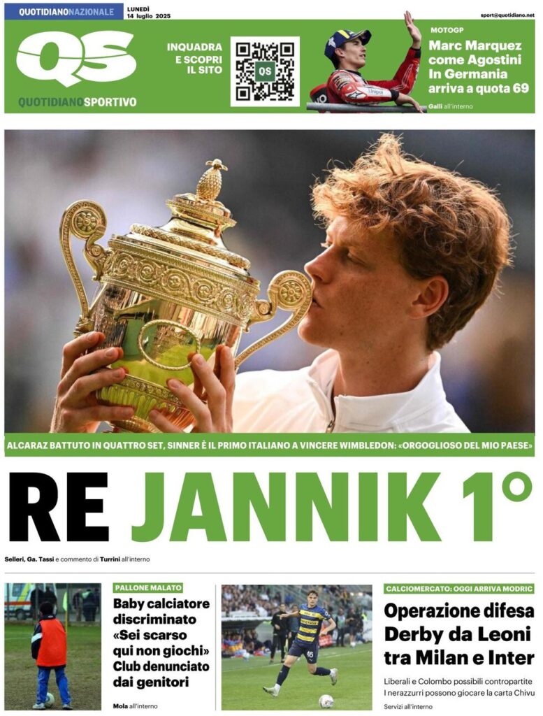 Ecco alcune delle prime pagine dei quotidiani dedicate al trionfo di Sinner a Wimbledon 2025: