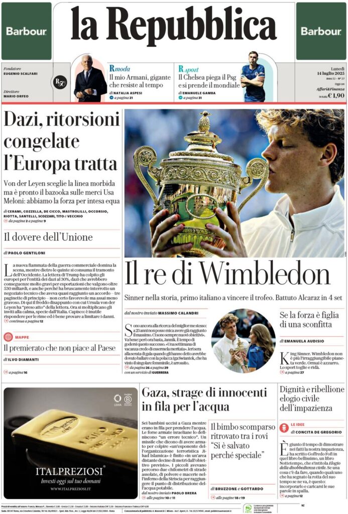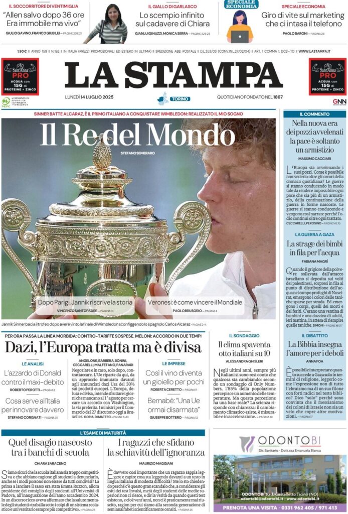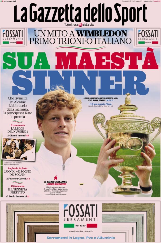 LE PRIME DEI QUOTIDIANI POST VITTORIA DI SINNER A WIMBLEDON 2025